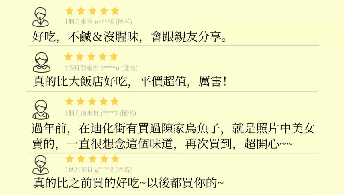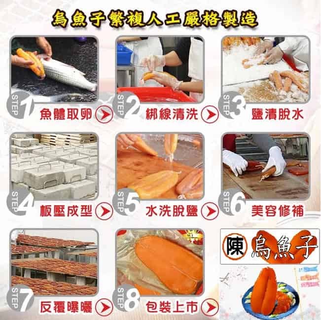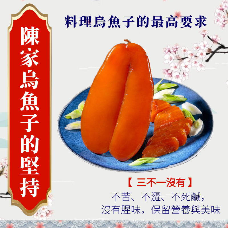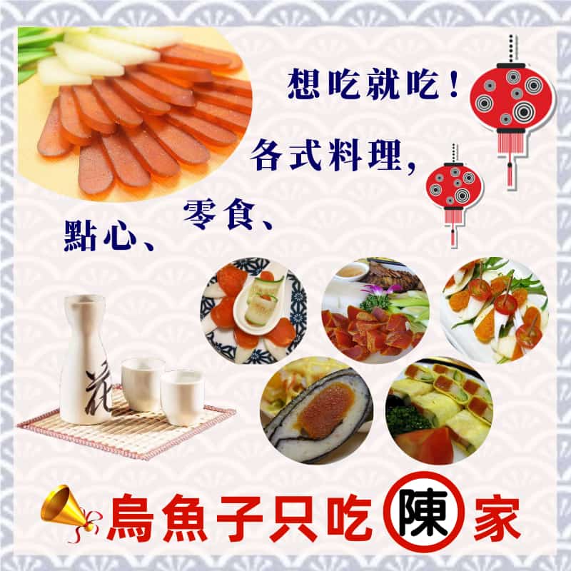 陳家烏魚子在經過上百次不同方式的研發試驗後,獨家研製出一套先採用中藥材蒸煮,後用強火灸燒烏魚子料理法,不僅把令人不喜歡的腥澀死鹹味道去除掉,還完整的保留了烏魚子豐富的營養。
