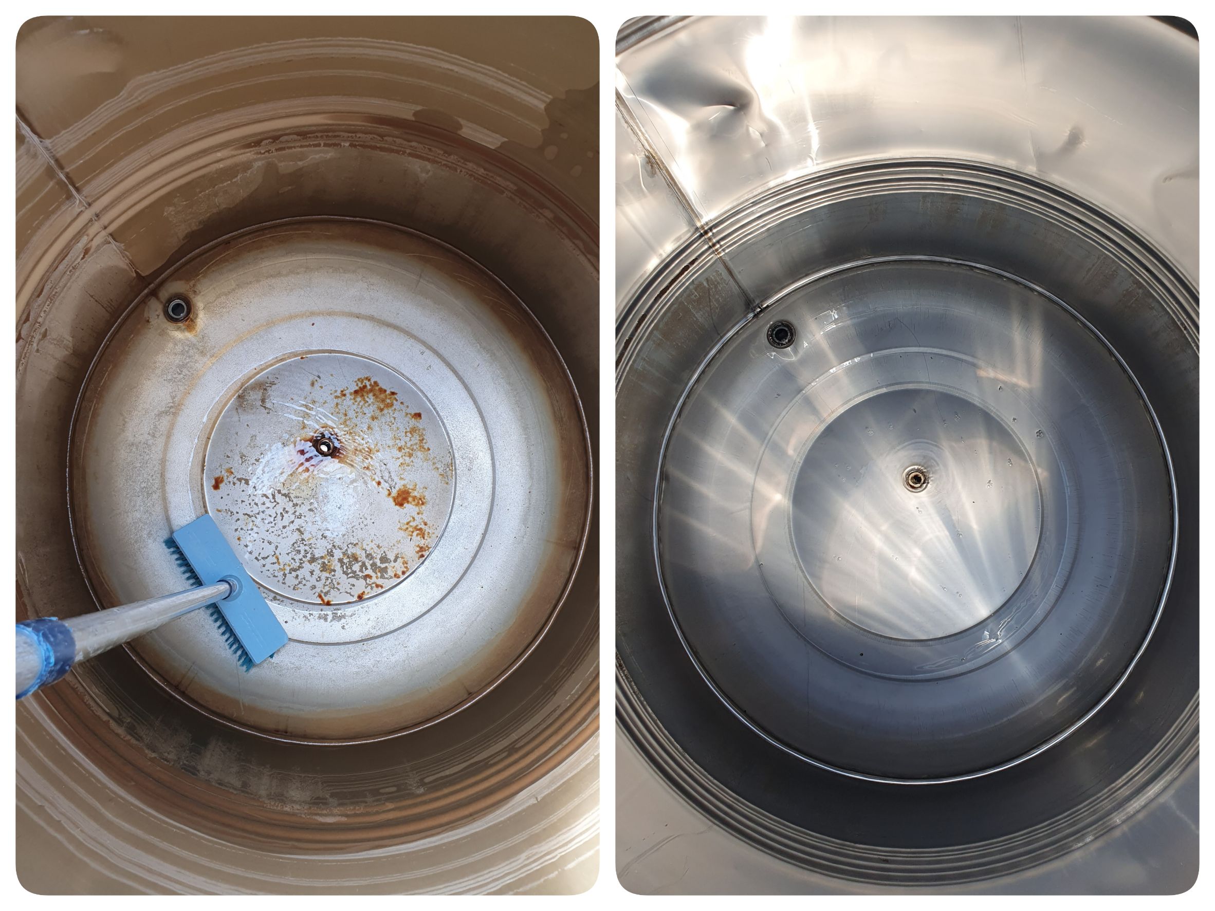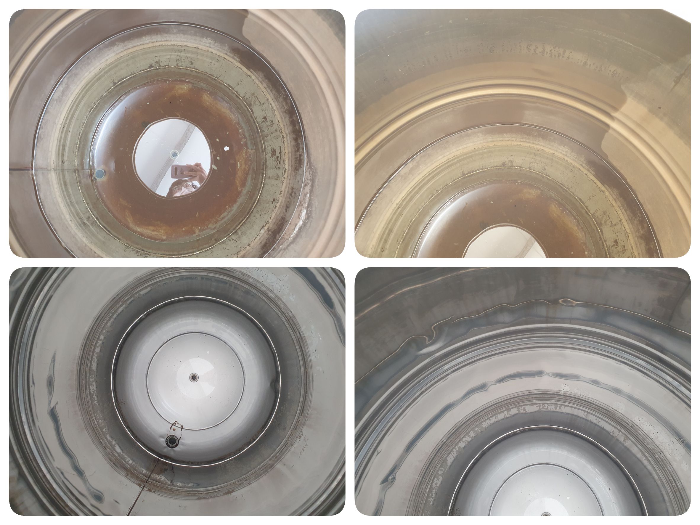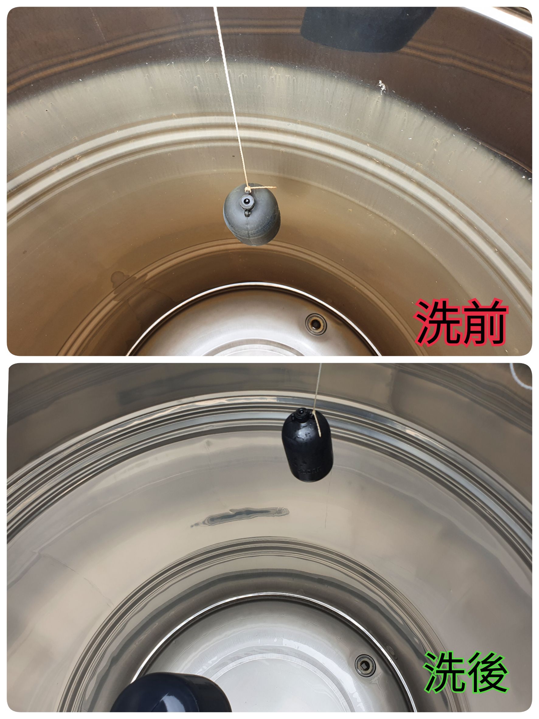排空水塔中的水後,我們會使用專用的水塔清洗藥水,這些藥水能有效溶解水垢,同時進行消毒。